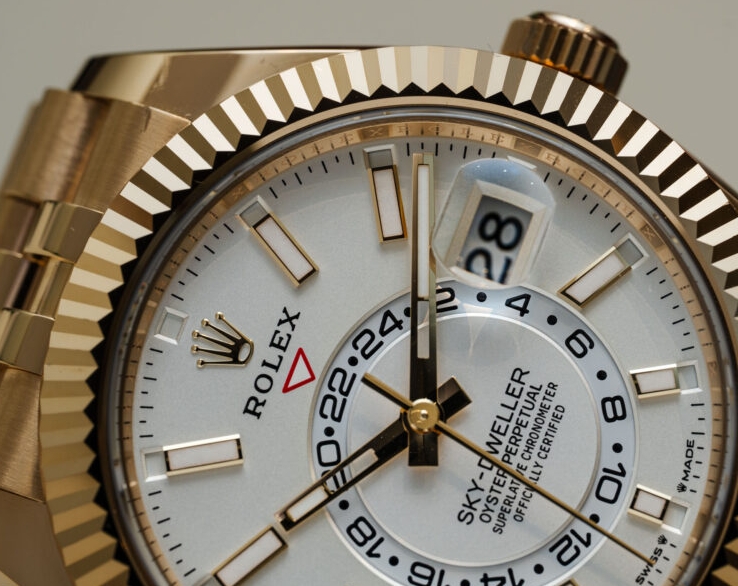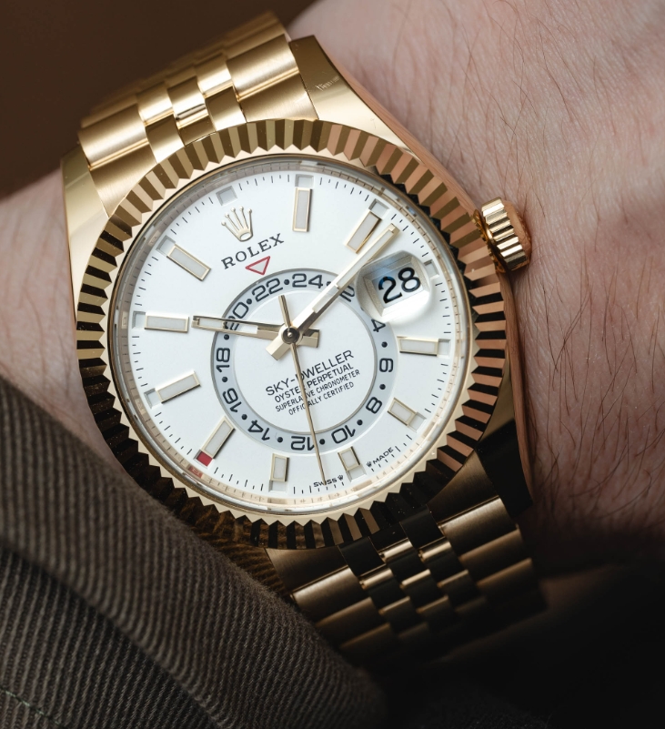 No brand does flashy gold watches quite like Rolex does. How many of us have childhood memories of older relatives wearing a glistening yellow-gold Rolex, understanding that that shiny timepiece signaled something important? For me, it was my grandfather’s cousin, whose gold Day-Date not only entered the room before he did, but because he wore it super loose, it also always had a habit of popping out from whatever kind of sleeves he was sporting that day. I often imagined his replica watches UK dropping into the fondue we regularly shared as a family, fishing it out with my cheese-dripping trident, and yelling out the French equivalent of “finders keepers.” I guess watches always took up some space in my brain, even at a young age. Despite all the hyped steel sports China replica Rolex watches that Rolex peddles these days, the gold dress pieces are still a massive part of its catalog. And for the brand’s biggest, boldest, and baddest gold dress watch, there’s the Rolex Sky-Dweller. Stepping out for the first time with a matching 18k yellow gold Jubilee bracelet at Watches & Wonders 2024, it’s surprising that it took Rolex this long to marry a yellow Sky-Dweller with its famed bracelet because they’re obviously made for each other. We went hands-on with the yellow gold Rolex Sky-Dweller 336938 watch with a Jubilee bracelet and white dial to review how this modern gold brick stacks up against the Crown’s other yellow precious-metal pieces.